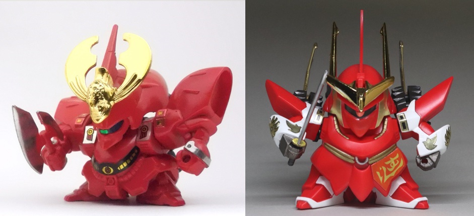 BB戦士No.8サザビーに強化武具セット1のパーツを装着して再現できる(写真左はGジェネ.2を使用)。